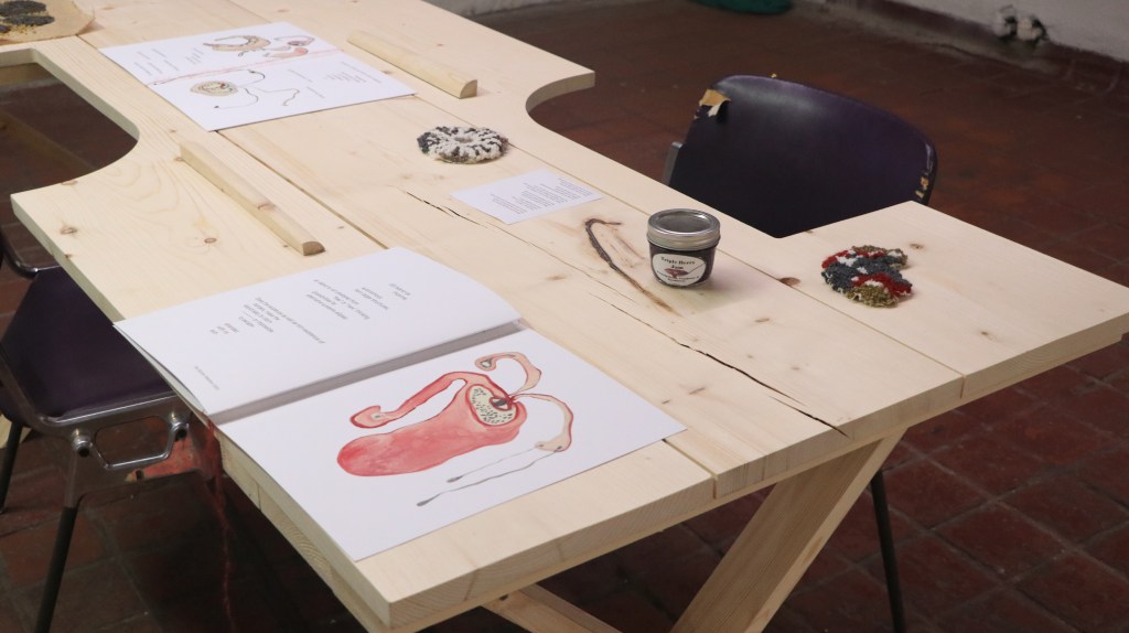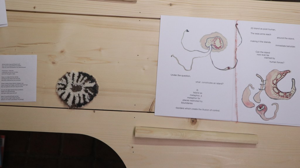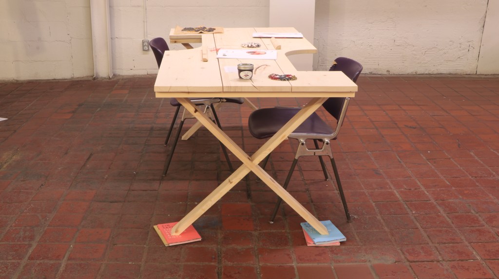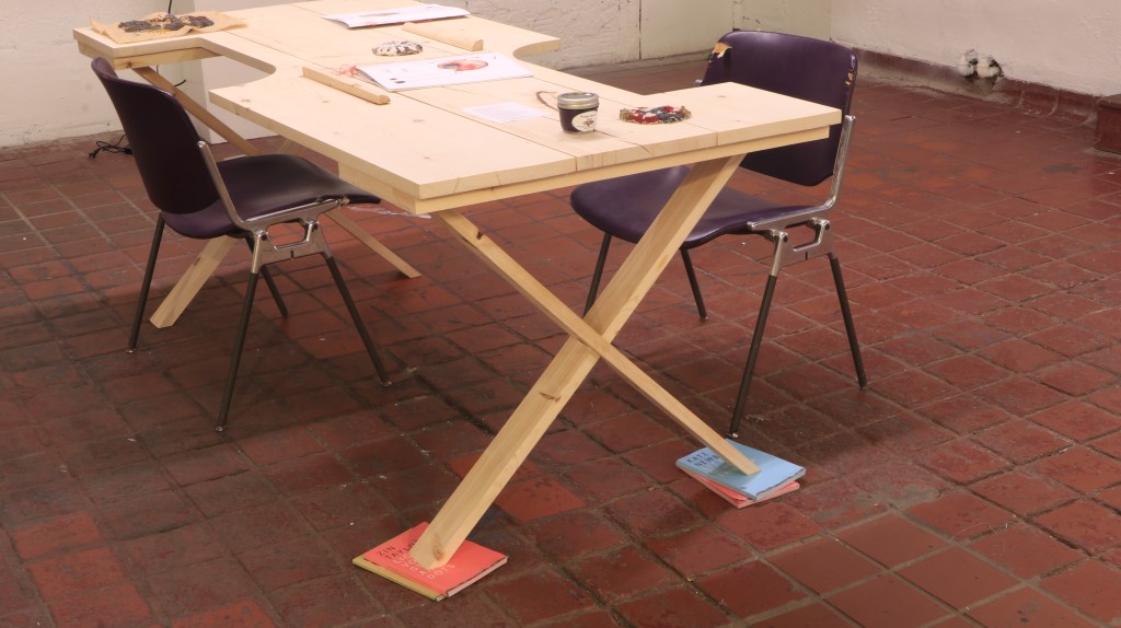Exhibition view, Sediments, on display at Daniels Copying desk by Gareth Long and Rahul Sehjipaul.
