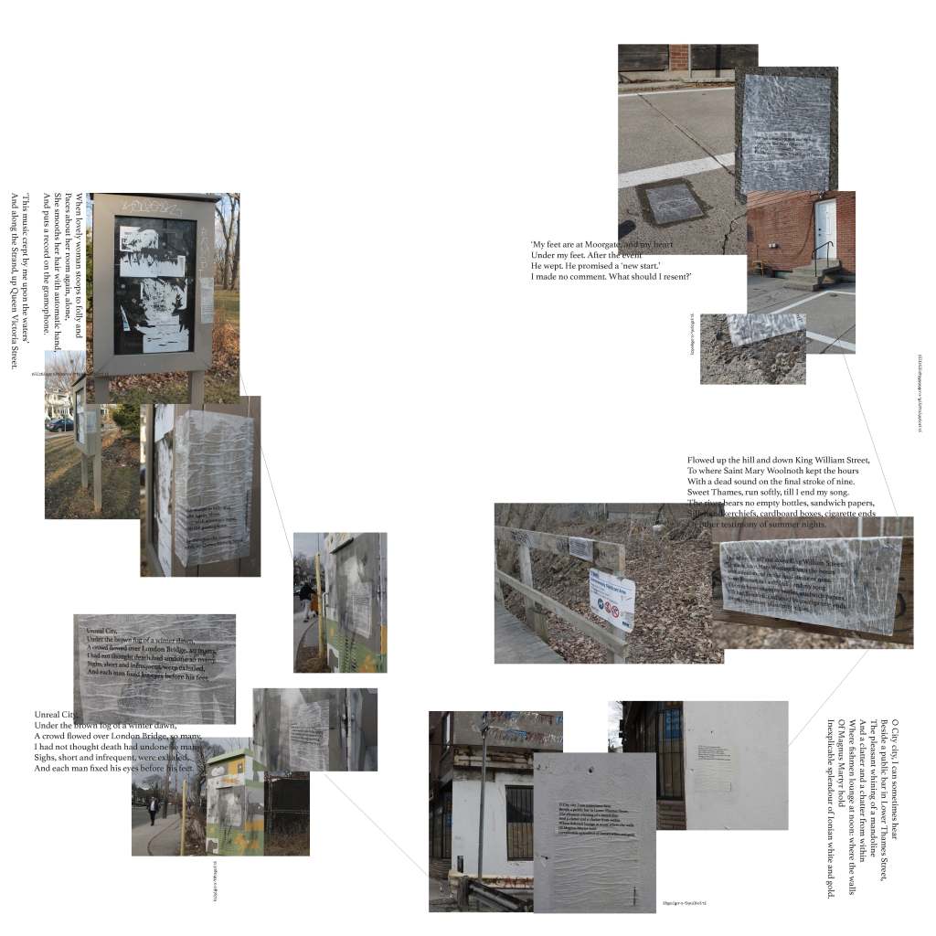 Wastelands of one’s own (2024) was brought into reality through the superimposition of London, England over a map of Toronto at equal ratio, the location of each intervention’s coordinates with a different location discussed in Ts. Eliot’s The Waste Land. This Canonical work originally published just over one hundred years ago in England, plays on the dejection of community in London following the first world war and the societal transformation which occurred during the interwar period. Under the context of present-day Toronto, the writings’ of T.S. Eliot takes on new meanings. In the “after-math” of Canada being under British Rule, a spectre of British culture continuously lingers, from street names to Governmental and economic systems, their foundation of “Canada” remains ever present.